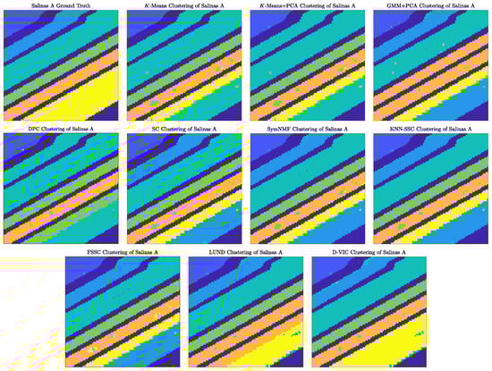 As visualized in Figure 6, D-VIC achieved nearly perfect recovery of the ground truth labels for Salinas A. Most notably, though all comparison methods erroneously separate the ground truth cluster indicated in yellow in Figure 5a (corresponding to 8-week maturity romaine), D-VIC correctly groups the pixels in this cluster, resulting in performance that was 0.089 higher in OA and 0.110 in than the that of LUND, its closest competitor in Table 2. As such, downweighting high-density points that are not also exemplary of the latent material structure improves not only modal but also non-modal labeling. Moreover, what error does exist in the D-VIC clustering of Salinas A could likely be remedied through spatial regularization or smoothing post-processing [,].