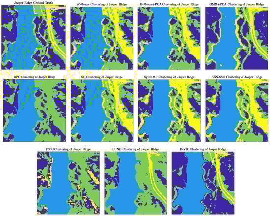 Comparison of clusterings produced by D-VIC and related algorithms on the Jasper Ridge HSI. D-VIC outperforms all other algorithms, largely due to superior performance among pixels corresponding to tree and soil classes (indicated in dark blue and green, respectively).