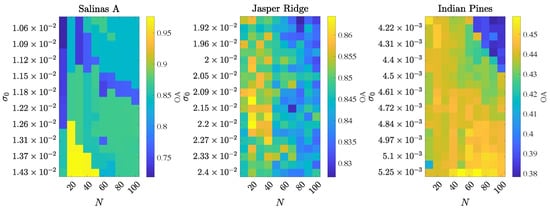 This section analyzes the robustness of D-VIC’s performance to hyperparameter selection. For each node in a grid of , D-VIC was implemented 50 times, and the median OA value across these 50 trials was stored. Performance degraded as N increased substantially past 100, and such a choice is not advised. In Figure 8, we visualize how the performance of D-VIC varies with N and . The relatively small range in nominal values of in our grid reflects that pixels from the HSIs analyzed in this article are relatively close to their -nearest neighbors on average. As is described in Appendix A—where our hyperparameter optimization is discussed in greater detail—the range of used for each grid search is data-dependent, ranging the distribution of -distances between pixel spectra and their 1000 -nearest neighbors.