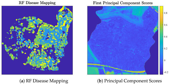 Visualizations of the Madingley HSI. The RF disease mapping is visualized in (a) and the Madingley HSI’s first principal component scores are visualized in (b). In (a), yellow indicates severely-infected ash, green indicates infected ash, and light blue indicates healthy ash.