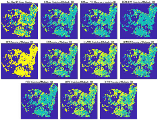 Though many graph-based HSI clustering algorithms exhibited similar levels of overlap with the supervised RF disease mapping, substantial differences exist between the unsupervised disease mappings obtained by different clustering algorithms, as can be observed in Figure 11. Indeed, LUND and D-VIC tended to predict ash dieback disease in regions considered healthy according to the RF disease map []. On the other hand, other similarly-performing graph-based clustering algorithms (SC and KNN-SSC) tended to label trees as healthy even in regions where the RF disease map indicates substantial dieback disease infection []. All clusterings exhibit salt-and-pepper error, indicating that spatial regularization [,] or majority voting within tree crowns [,] may improve overlap between unsupervised clusterings and the RF labeling even further.