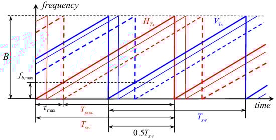 The main challenge in designing a polarimetric radar is the orthogonality of the sounding signals, which strongly affects the isolation between the polarimetric radar channels. Bad polarimetric isolation limits the system’s ability to observe weak targets in an environment with other strong targets and clutter. Therefore, a novel method for quasi-simultaneous measurement of the PSM was developed for the PARSAX radar []. Based on the work of Babur et al., a pair of linear frequency modulated (LFM) signals with a positive slope are time-shifted from each other to allow the occupation of different frequency bands continuously, as illustrated in Figure 1. For this research, a time delay that equaled 0.5 of the sweep repetition time was used. Due to this relative time delay corresponding to a frequency shift, the signals’ orthogonality could be considered, and a high polarimetric isolation level could be achieved. Here, the first signal was transmitted with horizontal polarization, whereas the shifted LFM signal was vertically polarized. The FMCW deramping technique provided the possibility to mix each received signal with both transmitted signals, resulting in beat frequency spectra corresponding to all range bins and all scattering matrix elements. This provided the radar with the ability to transmit and receive horizontally and vertically polarized electromagnetic waves in parallel. Utilizing sounding signals with orthogonally polarized components is a strong advantage compared with many other existing polarimetric radar systems, which measure the elements of the polarization scattering matrix by switching the polarization mode of the transmitter or receiver from pulse to pulse. This causes a temporal measurement mismatch, which is not desirable when using polarization information for target detection and classification algorithms [,]. A detailed block diagram of the system of the PARSAX radar can be found in [].