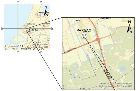 In this work, real-world polarimetric radar data were captured by PARSAX while observing a dense highway (the A13 between Delft and Rotterdam in The Netherlands). The targets were present at a slant range from approximately 3 km to 4 km. The radar was positioned on top of a building with a height of approximately 90 m and was pointed toward the highway. A map is visualized in Figure 2. As can be seen, the direction of the vehicles on the highway was approximately in the same direction as the line of sight of the radar. Hence, the radial velocity would almost be equivalent to the absolute velocity. Note that the maximum speed on this highway was 100 km h−1.