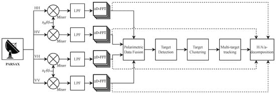 The main concept of the H/A/ decomposition technique is that the H, A, and α features of the targets can be used to identify the underlying average scattering mechanism. These parameters are extracted from eigenvalue analysis of the average coherency matrix [], which can be derived by either time averaging or spatial averaging. Hence, it is required to find clusters of detected cells that represent the targets and to track each target over time. Therefore, all moving vehicles that can be observed by the radar need to be detected and tracked, which is performed in the most straightforward manner in the range-Doppler domain. As a result, a dedicated signal and data processing chain to process the real-world data were developed, of which an overview is illustrated in Figure 3.