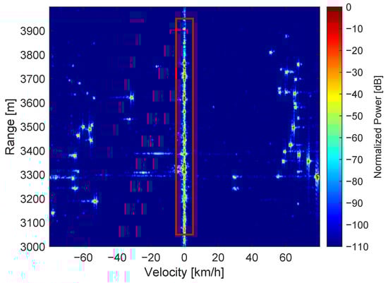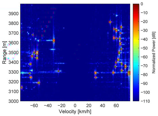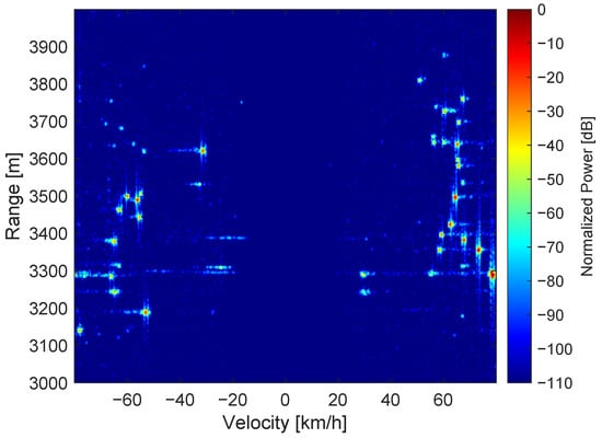 As target detection would be applied in the range-Doppler domain, a two-dimensional fast Fourier transform (FFT) was performed over fast and slow times to provide the range-Doppler map for each of the four polarimetric channels. Whereas the first FFT was applied for range compression with a Hamming window, before the second FFT, an 80 dB Chebyshev window function was applied to the data in order to reduce the sidelobe levels and spectral leakage such that the sidelobe level was constant []. The normalized range-Doppler spectrum of the first frame of a single polarization channel is shown in Figure 4, where the Doppler frequency was converted to the radial velocity.