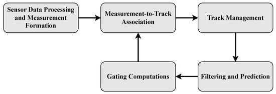 To describe the polarimetric signatures of multiple different targets, each target needed to be tracked over time. In order to track multiple targets from frame to frame, a multi-target tracking (MTT) algorithm was developed. Each MTT problem is different, depending on the number of objects that are present, the sparsity of the objects, and the required performance of the tracking algorithm. Uncertainty concerning the observations or detections of the objects and the prediction of the objects’ paths make a multi-target tracking problem challenging. A block diagram of the basic elements of an MTT algorithm [] is shown in Figure 7.