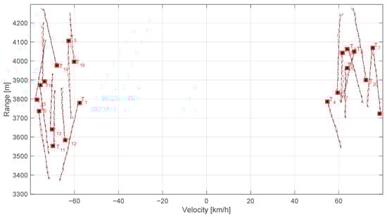 Subsequently, this MTT algorithm was applied to the real-world polarimetric radar data, as introduced in Section 2.2. When visually inspecting Figure 10, illustrating the track results after 20 time frames, for each target, the estimated trajectory in the range-velocity domain is shown. The estimated current state , predicted state , and corresponding associated measurement are plotted as well.