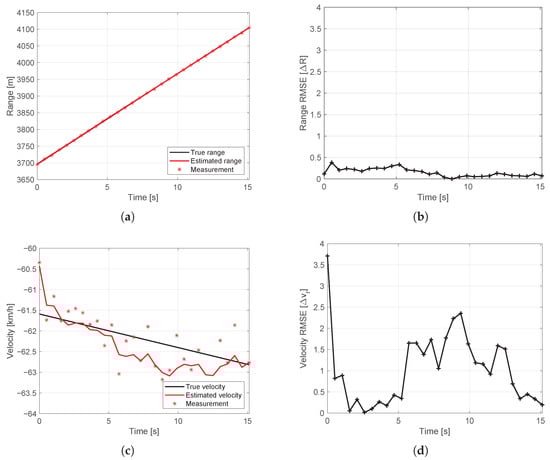 It can be seen that the estimated range almost perfectly followed the true range. The RMSE of the estimation of the range and the velocity of the target with respect to its true range and velocity were found to be smaller than m and m s−1, respectively.