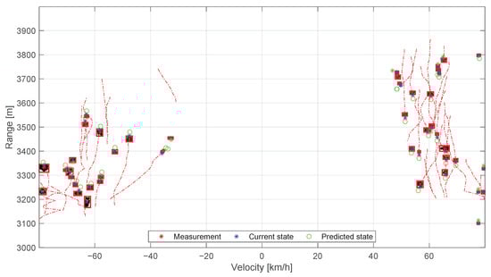 Estimated trajectories in the range-velocity domain of vehicles on a highway after 20 time frames. For each target, the estimated trajectory, estimated current state , predicted state , and corresponding associated measurement are plotted.