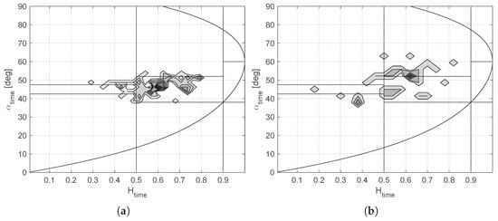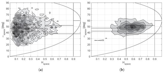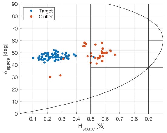 Spatial averaging is implemented to find the average coherency matrix . In this case, the PSM of all bins of each target’s cluster was collected and averaged, resulting in a single value for H, A, and for each target for each time frame. This resulted in 93 values for H, A and per target. Again, the two-dimensional histogram of all targets of all time frames is visualized in the H/ plane in Figure 12a. Similarly, spatial averaging was applied to the polarimetric information of the static clutter as well. The resulting distribution is displayed in Figure 12b.