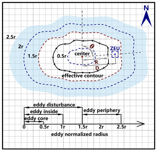 The distance (D) of the grid center from the eddy center was normalized by the distance of eddy effective contour from the eddy center (R). Each eddy was matched with the valid ZEU data on the same date, and the center of the gird coordinates, ZEU value, azimuth angle (θ), and relative radius (r) were recorded within 2.5r (Figure 1). The eddy effective contour is defined as the largest contour of the detected eddy. Compared with the matching method of fitting contours with a circle, an effective contour is more advantageous for analyzing the eddy 3D structure and submesoscale eddies. Meanwhile, this can preserve the anisotropy of eddy. We divide the eddy from inside to outside into eddy core (0–0.5r), eddy inside (0–1r), eddy disturbance (0–1.5r), and eddy periphery (1.5–2.5r, the filled area in Figure 1).