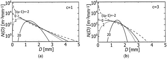 (a,b) Sample DSDs of different shapes that are generated by the generalized gamma distribution. The liquid water content (LWC) and characteristic diameter (Dm’) are fixed as 0.5 g m−3 and 1.5 mm. Adapted from [31]. © American Meteorological Society. Used with permission.