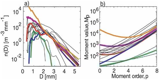 (a) Samples of observed one-minute DSDs from POSS in Montreal. (b) Their moment values with moment order. Five DSDs were highlighted by different colors. Adapted from [43]. © American Meteorological Society. Used with permission.