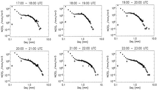 Hourly DSDs from the 2DVD (plus signs) and 2DVD–MPS combined (open diamonds) adapted from Figure 11 of [52]. DSDs show the so-called “S-shape” with higher number concentration in smaller and medium sizes. © American Meteorological Society. Used with permission.