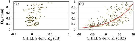 Figure 7a shows the variation of Dm computed from the full DSD spectra vs. the measured Zdr from the S-band radar. Values of Dm (note the y-axis is on a log scale) range from 0.2 to 1 mm but Zdr can be seen to be around 0 dB, sometimes even negative (due to noise fluctuations). On the other hand, the S-band Zh shows more variation with Dm. The red dotted line represents the fitted equation. Although there is a considerable amount of scatter, the fitted equation seems a better way to estimate Dm (but with significant uncertainties). The equation will be tested for other light-rain events, e.g., in Wallops Island, a mid-latitude coastal region, where a large set of disdrometers and other instruments are located within the coverage of the S-band NPOL radar [90].