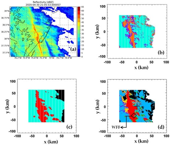 (a) Reflectivity from the NPOL gridded data for the 30 April 2020 event at 21:06 UTC; (b) DSD-based rain type classification (orange: convective, cyan: stratiform, purple: mixed); (c) Texture-based classification (red: convective, cyan: stratiform); (d) matched and mismatched rain-types (see text for details), with the ground instrumentation site marked as WFF. Adapted from [93]. © American Meteorological Society. Used with permission.