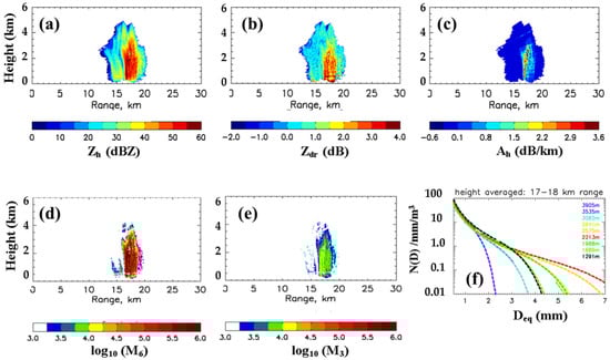 The estimation of [Nw, Dm, μ] using the Testud normalization was developed by [79]. They used a linear relation of axis ratio vs. D with a slope of β (i.e., b/a =1 − βD) along with theoretical gamma DSDs covering a wide range of [log Nw, Dm, μ] based on [27]. Their goal was to first estimate β as the hypothesis that abs[β] decreased from mid-latitude rain (0.063 per mm) to tropical rain (0.045 per mm) to account for large amplitude oscillations due to the collisional processes which collide with collisional energy [80] insufficient to break up in the warm rain as opposed to damped oscillations due to rain forming from melting graupel/small hail. A complicated nonlinear regression was used to develop an algorithm for β in terms of Zh, Zdr, and Kdp which involved products of power laws, e.g., β = 2.08 Zh−0.365 Kdp0.38Zdr0.965 where Zh is mm6 m−3, Kdp in deg km−1 and differential reflectivity expressed as a ratio. In retrospect, Gorgucci’s ansatz must be considered remarkable. For example, Dm is retrieved using Dm = a Zhb Zdrc where a = 0.56, b = 0.064, c = 0.024 β−124. The total error (sum of parameterization and signal fluctuation errors) are quoted as 20% for the normalized standard deviation (or, NSD) when Zdr is around 2 dB. Similarly, the NSD of log NW is 16% when NW ≈ 8000 mm−1 m−3. These low NSDs are based on disdrometer-measured DSDs but no comparison with radar was given.