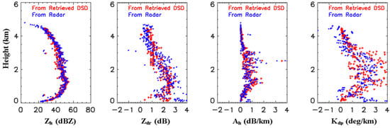 However, observed DSDs in nature vary with microphysical processes and their variation goes beyond the change of the slope in the exponential DSD. Their variation is linked with a change in mean diameter, spectral width, the total number concentration, and the shape of the DSD. Waldvogel [26] showed a systematic change of N0 within a widespread rain event due to change in the convective activity and used two parameters (N0 and λ) exponential DSD to explain DSD variation. In this expression, the N0 is a variable, and N0 and λ are defined as the intercept and slope parameters of exponential DSD that have the same liquid water content and radar reflectivity factor as the observed DSD. Thus, the derived N0 and λ are not the same as the directly fitted variables in the observed DSD.