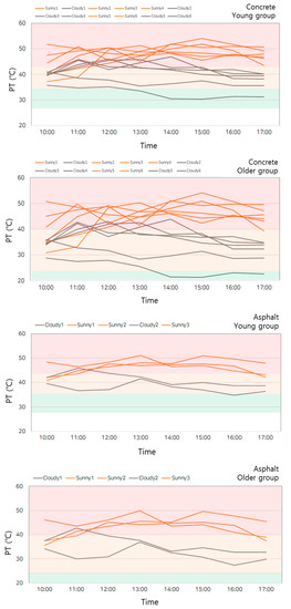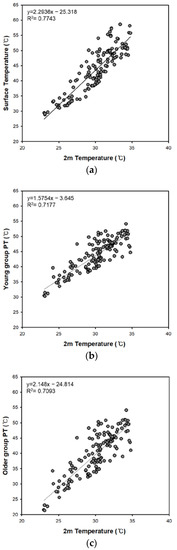 | 2 m Temperature (°C) | Surface Temperature (°C) | Young Group PT (°C) | Older Group PT (°C) |