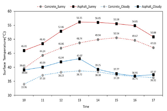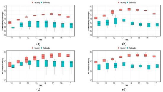 According to the comparative analysis by averaging the time-specific observation data (Figure 6), at 13:00 on sunny days, the difference in road surface temperature between concrete and asphalt was 7.41 °C, and the difference in 2 m temperature was 0.75 °C, showing a large deviation in the road surface temperature. The 2 m temperature on cloudy days was higher at the concrete site than at the asphalt site, and a difference in 2 m temperature between sunny and cloudy days was observed at the concrete site.