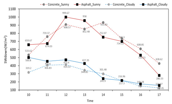 At the concrete site, the average downward short-wave radiation for 6 sunny days was 719.93 W/m2, and the average downward short-wave radiation for 6 cloudy days was 284.71 W/m2. At the asphalt site, the average for 3 sunny days was 694.29 W/m2, and that for 2 cloudy days was 331.10 W/m2. The temperature, humidity, and radiation data were inputted into the solar radiation model to calculate the hourly mean radiant temperature. The mean radiant temperature of concrete on sunny days increased up to 70 °C (at 15:00), and on cloudy days, the mean radiant temperature was sometimes below 40 °C even during the day. On sunny days, the daily mean downward short-wave radiation was 777.56 W/m2 at the concrete site and 793.73 W/m2 at the asphalt site. Thus, it was slightly higher at the asphalt site. According to the analysis by time at each site, at 10:00, the mean radiant temperature was 46.3 °C at the concrete site and 61.0 °C at the asphalt site, thus approximately 15 °C higher at the asphalt site. In contrast, at 17:00, it was 62.3 °C at the concrete site and 43.3 °C at the asphalt site, thus approximately 19 °C higher at the concrete site. On cloudy days, the radiation flux reaching the ground was reduced owing to the influence of clouds, so the temporal changes in mean radiant temperature also differed. The highest mean radiant temperature at the concrete site was 60.6 °C at 14:00 pm, while that at the asphalt site was 60.4 °C at 12:00.