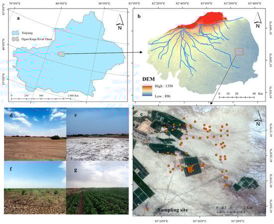Location of the study area. (a) The sampling area is in Xinjiang, China. (b) The study location is at the intersection of farmland and desert in the Ogan-Kucha River Oasis, with Digital Elevation Model (DEM) data in the background. (c) Locations of sampling sites. (d–g) The main surface types at the sampling sites, in order of preference, are desert, salt crust, desert vegetation, and cotton.
