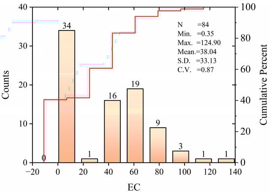 Figure 2 shows the characteristics of the EC statistical distribution of soil samples in the study area. The range of EC was 0.35–124.90 dS m−1, with a mean of 38.04 dS m−1, a standard deviation of 33.13 dS m−1, and a coefficient of variation of 0.87, which indicates moderate variation. The results show that the soil salinity in this area is relatively high; it is greatly affected by salt and the overall salinization is relatively serious. In this paper, the Kennard–Stone (K–S) algorithm is selected to randomly divide all soil samples into a training set (t) and verification set (v) to ensure the stability of the model. Sets (t) and (v) were separated in the ratio of approximately 7:3, where set (t) had 58 soil samples and set (v) had 26 soil samples. As shown in Table 5, the distributions of sets (t) and (v) are like those of the entire data set; the soil salinity of both datasets is representative of the whole dataset and can be used to calibrate the model to generate more satisfactory predictions.