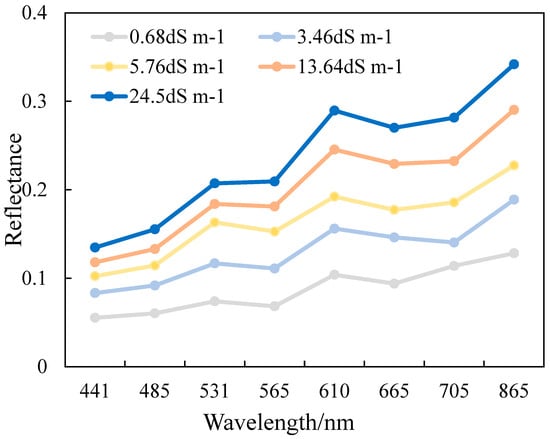 As shown in Figure 3, different soil salinities showed similar spectral shapes and amplitudes of spectral reflectance curvature, which increased with increasing soil salinity. Soil spectra showed significant reflectance fluctuations in the visible (VIS) and near-infrared (NIR) range, are relatively flat in the 400–600 nm and 650–713 nm ranges, and exhibit sharp increases in reflectance values at 600–620 nm and 845–885 nm. The first peak was observed in the yellow band followed by a maximum in the NIR band. The spectral difference of 0.68 dS m−1 saline soil is not obvious in the NIR band. The results tentatively determine that the yellow band and NIR band reflectances can distinguish soil samples with different salinities and different sensitivities to salinity. This preliminary analysis provides the basis for the subsequent satellite index development.