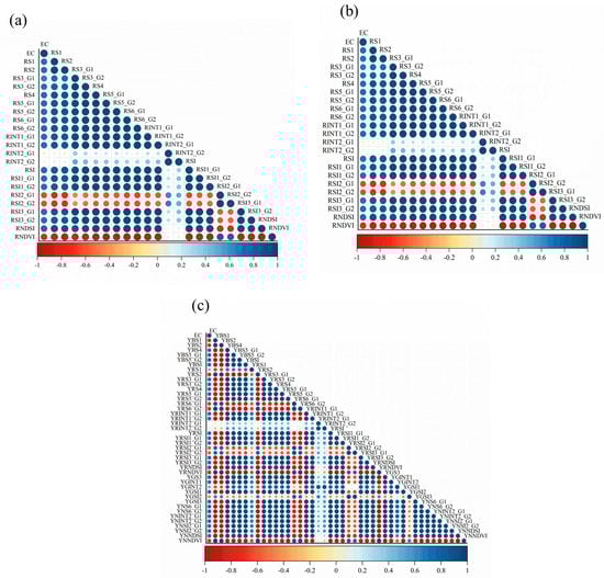 Relevance of the correlation between electrical conductivity (EC) and different soil salinity indices. (a) shows the Pearson correlation between the original salinity index and soil salinity. (b) shows the Pearson correlation between the new red-edge salinity index and soil salinity, and (c) shows the Pearson correlation between the new yellow-edge salinity index and soil salinity.
