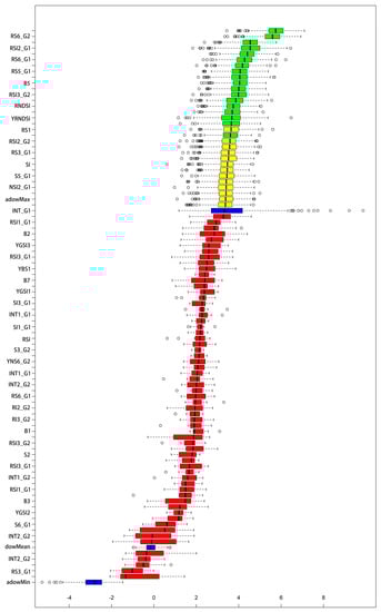 Boruta’s algorithm determines the importance of the existing and new salinity indexes. The blue variables are shaded features, the green variables are essential, the yellow ones are undetermined, and the red ones are irrelevant.