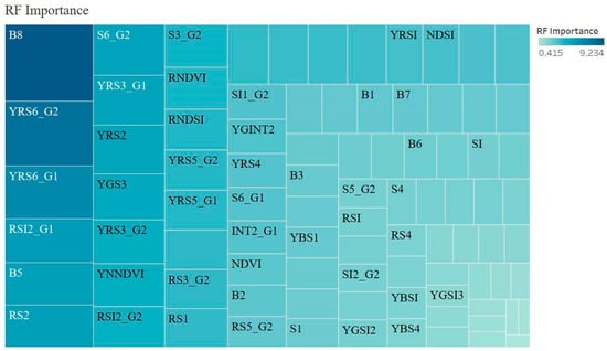 The results of the Boruta algorithm show that 20 spectral indicators are important, 14 are uncertain, and 60 are unimportant among the 94 salinity indicators (Figure 5). Among them, the band indicators are essential for B8 and B5, and the importance of B8 is greater than that of B5, indicating that the NIR band (B8) has the most vital relationship with soil EC. This finding confirms the higher sensitivity of EC within the NIR band, followed closely by the yellow band (B5). There are two original salinity indicators, NDVI and S6_g2, six new red-edge and ten new yellow band salinity indicators. The newly constructed spectral indices can accurately indicate soil salinity, as the newly constructed salinity indices have a significant share of 80%. The percentage of yellow band salinity indicators is 50%, and the results show that the yellow band (B5) plays a vital role in EC.