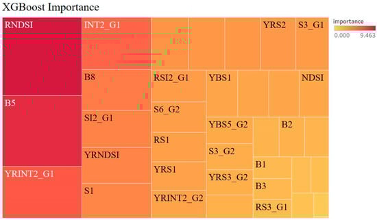 PLSR is a statistical method for finding a linear regression model by projecting the predicted and observed variables into a new space []. It is one of the most widely used regression strategies for spectral modeling [,]. PLSR can simultaneously model multiple predicted dependent variables, thereby reducing dimensionality and avoiding multicollinearity []. PLSR combines the advantages of principal component analysis, typical correlation analysis, and multiple linear analysis and is more suitable for small samples than traditional multiple linear regression (MLR) []. This study used PLSR analysis to assess the potential relationships among dependent and independent variables. Still, considering the PLSR model’s uncertainty, errors occurred in predicting the predictors []. Therefore, band feature optimization, which can reduce the uncertainty and error, is critical to the performance of the PLSR model. For this reason, three strategies with different options for band importance screening are established in this work []: Boruta feature selection, random forest (RF) classification, and extreme gradient boosting (XGBoost).