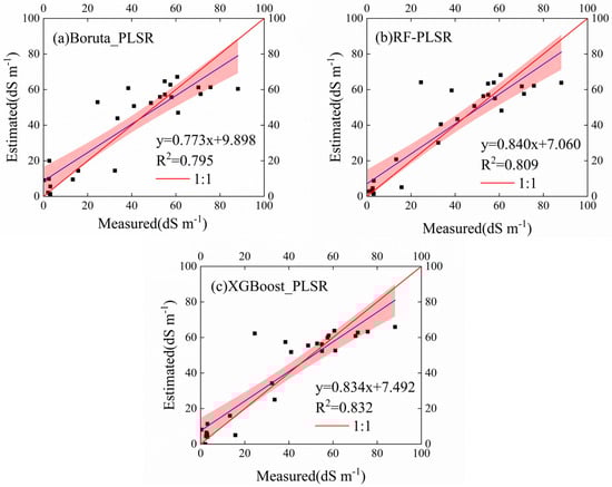 Scatter plots of the measured versus estimated electrical conductivity (EC) using different models with various modeling strategies: (a) random forest partial least-squares regression (RF-PLSR), (b) Boruta-PLSR, (c) extreme gradient boosting (XGBoost)-PLSR.