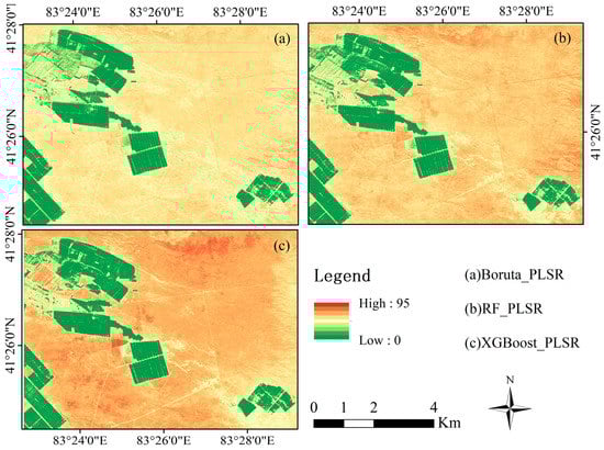 We used PLSR models with three strategies (Boruta, RF, and XGBoost) to generate maps of the spatial distribution of soil salinity in the study area. We found that the three strategies had sound mapping effects on soil salinity by comparing Figure 9. The trends of soil salinity were generally similar across the three strategies, with the low soil salinity areas concentrated mainly in the interior of the oasis and the high soil salinity focused primarily in the desert area. The XGBoost-PLSR model produced the best model accuracy with predicted soil salinity intervals in the range of 0–125 dS m−1, matching the measured soil salinity data. The Boruta-PLSR and RF-PLSR models were slightly less accurate, with predicted values in the ranges of 0–91 dS m−1 and 0–95 dS m−1, respectively. Second, the XGBoost-PLSR model better reflects the finer variations of soil salinity and the areas of low, medium, and high soil salinity are more clearly defined, making it easier to observe the spatial variations of soil salinity. Overall, the spatial distribution of soil salinity was better predicted based on the XGBoost-PLSR model, showing more detailed variations in soil salinity distribution.