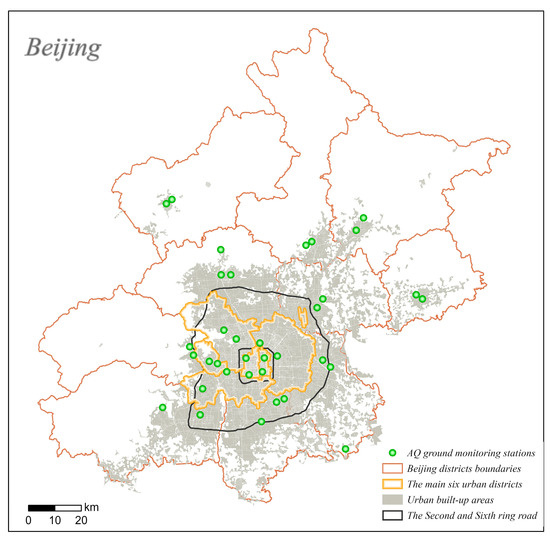 Map of study area, overlay with Air Quality (AQ) ground-station distributions (the green points). The built-up areas from [24] represent the urban extent in general; the ring roads witnessed the development and expansion of the city, which can help with understanding the urban, suburban, and rural areas of the city. In particular, the areas within the second ring road are the historic urban centers, while the sixth ring road is currently the outermost ring road.