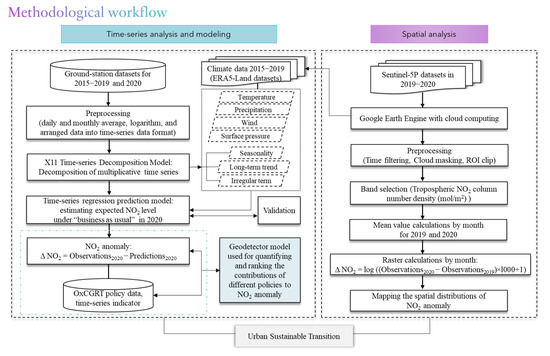 The methodological workflow proposed in this study is shown in Figure 2. The time-series analysis was conducted based on historical ground station datasets from 2015 to 2020 to detect the compounding factors that may affect NO2 changes. By further combining these data with climate data, a time-series prediction regression model was developed to estimate the expected NO2 level of 2020 (no COVID-19 restrictions). The NO2 anomaly between observations and predictions was used to build the Stratified Heterogeneity statistical model (Geodetector) to evaluate the effects of different containment policies. From spatial aspects, Sentinel-5P observational data for 2019 and 2020 were used to capture the distributions of spatial differences of NO2.