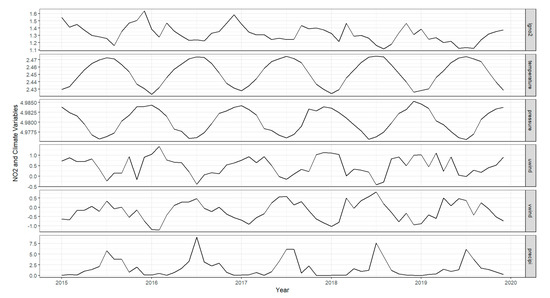 Apart from anthropogenic effects, the changes in NO2 concentrations were affected by meteorological effects [27] and seasonal variability. Therefore, this study collected the climate datasets of ERA5-Land from 2015 to 2020 from the Copernicus Climate Data Store (https://cds.climate.copernicus.eu/, accessed on 12 July 2019). ERA5-Land is a reanalysis dataset providing a consistent view of the evolution of land variables over several decades at an enhanced resolution. Some meteorological factors were collected, including the temperature of the air at 2 m above the surface of the land, total precipitation, Eastward and Northward components of the wind at a height of ten meters above the surface of the Earth, and pressure (force per unit area) of the atmosphere on the land surface. These data were used to examine the relationship between NO2 concentrations and meteorological conditions.