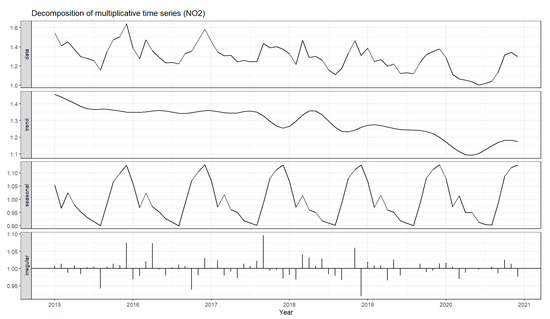 Decomposition of multiplicative time series of observed NO2 data from 2015 to 2020 based on ground station data. The top graph is the original observed NO2 data, consisting of trend, seasonal, and irregular components (the three bottom terms).