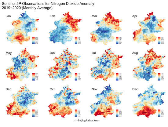 The complementary of historical ground-based data with satellite datasets enables a more comprehensive evaluation of NO2 anomalies than monitoring with a single source, by leveraging the strengths of both monitoring datasets. More specifically, in this study, the available long-term ground-station observation data are used to construct a time-series model to eliminate compound and mixed effects, such as seasonal and structural emission control effects, to extract partial anomalies attributed to strict policy measures. The current Sentinel 5P has no such long historical records prior pandemic applicable for temporal analysis, and here it was mainly used to map spatial variations of NO2 in 2019–2020 and helped with better interpretations of the time-series results. In addition, the ground station data represent measurements at discrete points, providing non-continuous surface monitoring, and cannot reflect the spatial distribution or variations of NO2. Instead, satellite monitoring enables continuous observation of NO2 concentrations in “column” over space, though it is not analogous to ground-station monitoring. In particular, it can detect the spatial heterogeneity of the NO2 level and give spatially resolved information for the urban structure that single ground monitors or aggregated average data cannot reflect, as we discussed in Section 4.3. With advancements in satellite technologies, the TROPOMI satellite instrument can infer ground-level NO2 concentrations at a finer spatial resolution using specific models and obtain continuous observations over a longer duration.