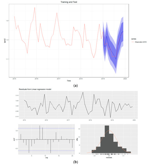 Model performance assessment results and the residuals analysis of the time-series multi-linear regression prediction model. (a) The validation results in terms of using the data for 2015–2018 for training and the 2019 observation data for comparison. (b) A time plot, the ACF, and the histogram of the residuals from the multiple regression model fitted to the NO2 data, as well as the Breusch–Godfrey test for jointly testing up to 16th-order autocorrelation. The histogram shows that the residuals seem to be slightly skewed, which may also reflect the coverage probability of the prediction intervals.