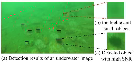 Over the past few years, the technology used to detect underwater objects has become increasingly widely used, for example, in tasks such as underwater ecological monitoring, underwater pipeline maintenance, and wreck fishing [1,2,3,4,5,6]. Mainstream methods for underwater object detection fall into two main types: optical imaging and sonar. However, the optical image detection method has significant advantages in underwater object detection tasks at close range, as an optical image has a high resolution and good flexibility. However, unlike object detection in natural images, optical underwater imaging is affected by scattering and absorption of water bodies, which would produce images with more severe degradation [7,8]. As a result, underwater images have the following characteristics: low contrast, non-uniform illumination, and blurring, due to various complex environments. More specifically, object size in the image is usually less than pixels, and the object signal-to-noise ratio (SNR) is much lower than −3 dB; we refer to this as the feeble and small object, as shown in Figure 1. As a result, the task of optical underwater object detection with feeble and small objects is challenging. The main challenges for small object detection are low object resolution, complex backgrounds, insignificant features, and limited contextual information. This is usually combined with a low signal-to-noise ratio, which means that the object signal is very easily overwhelmed by the background signal. Moreover, the existing general purposed object detection algorithms have limited accuracy when directly applied to underwater object detection, and how to detect the object efficiently and effectively within a challenging underwater environment is an urgent task to be solved.
