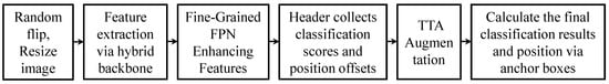 Overview schematic diagram of our algorithm. The images are fed into the network, first through a series of enhancements, then through a hybrid backbone network to extract features and a fine-grained pyramid to enhance the features. Finally, TTA is used to improve recognition accuracy.