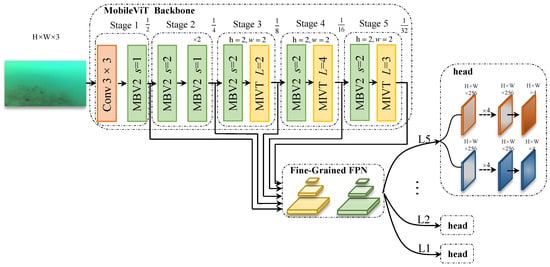 Overview of our detector. The input of the network is a color image with three channels, and the lightweight backbone is applied to extract multiscale features from the input image. A novel fine-grained FPN is applied to get feeble and small object friendly features. The hyperparameter L in the backbone is the repeated times of transformer blocks for each MobileVit module. The s in the MBV2 module is the down-sampling stride number relative to each module’s input.