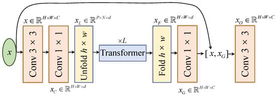 The transformer is a flexible solution for encoding the global context information of objects in images; however, pure transformer-based networks usually bring a huge computational footprint. Hybrid transformer-based networks, on the other hand, can benefit from a lightweight network with less computation and the ability to encode global-dependent contextual information. The MVIT block is a subnetwork that can be successfully inserted into a lightweight CNN to form a lightweight hybrid transformer-based network. With such a detector, it is easier to derive the global context of feeble and small objects. More specific construction of the MVIT block is described in Figure 4. As shown in Figure 4, for a given tensor x, where , C is the overall channel count for x, two successive convolution layers are employed to extract the local representations of the object, the output tensor is , and . For the feature map , the unfold layer in Figure 4 splits the feature map into a series of fixed patches the size of and stacks them together as the embedding vectors , where , , . The N is the overall count of patches, and the P denotes the dimension of the embedding vector. Then several successive vision transformer [41] blocks are applied to obtain the object’s global context information. In Figure 4, the number of used transformer blocks is L, and the L is 2, 4, and 3 for stage 3, stage 4, and stage 5, respectively, in Figure 3. Then the inverse layer of Unfold, Fold is used to convert the embedding sequence into the feature map and expands the channels of the feature map from to via a Conv ; contains rich global contextual information of objects and is concatenated with the input feature map x. Finally, a Conv is used to merge these two features and get the final feature vector , where .