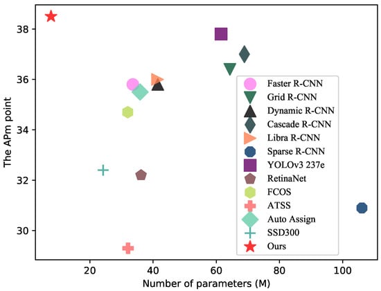 Trade-offs between performance and number of parameters for each model. The x-axis is the number of parameters of the model and the y-axis is the APm point of the model. The closer the model is to the upper left corner, the better the model performs. Our model is represented by a pentagram. Considering both the number of parameters and performance, our model has the best performance among many models.