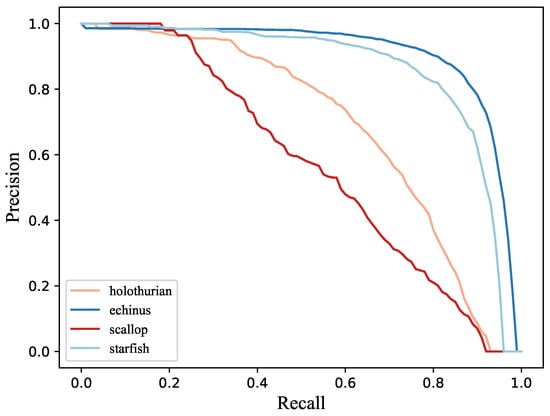 In addition, we comprehensively evaluate the differences between our model and the latest one-stage detectors. Compared with 237 epoch trained YOLOv3 [21], our model outperforms it by 0.7 points, which also means our model converges faster than YOLOv3. For the classical lightweight detector SSD300 [15] and recent adaptive one-stage detector Auto Assign [20], our model outperforms them by 6.1 and 3.0 points, respectively. ATSS [19] is another adaptive one-stage detector that performs well in general object detection in air. Our model surpasses this model by 9.2 points in the small size underwater image condition. In addition, we evaluate the performance of the typical anchor-free one-stage detector FCOS [55] on small-sized underwater images, and we find that our detector outperforms this model by 3.8 points. It is noteworthy that our model has the fewest parameters of all the models noted above. We use the number of parameters as a measure of time-space complexity: the larger the number of parameters, the higher the time-space complexity. In addition, to test the real-time properties of the model, we conducted experiments on the RTX 3080; the model provided real-time detection at 22.6 fps.