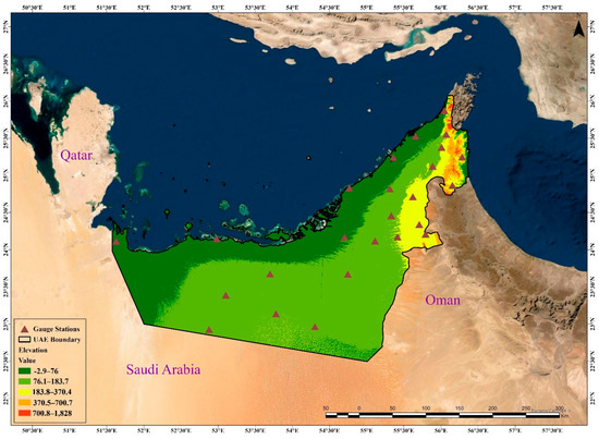 Figure 1. The geographical location of the United Arab Emirates with elevation map and the gauge locations used in this study.