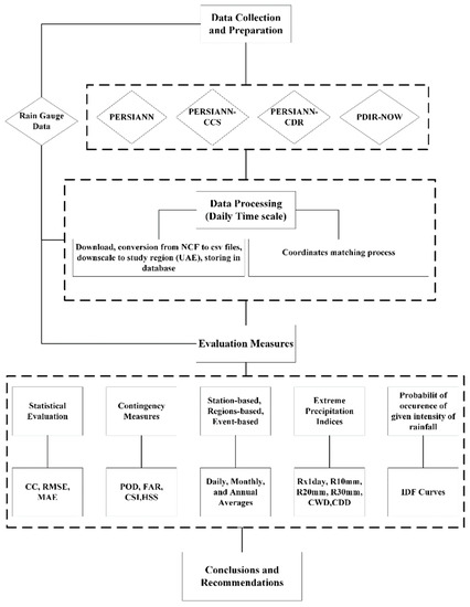 To investigate the usefulness and validity of the PERSIANN family products in the UAE, various statistical, contingency, and extreme climate measures were utilized in this study. Moreover, to study the in-depth analysis, annual average rainfall and daily averages of the products were compared with rain gauge data. Finally, the effectiveness of the studied products is shown by developing Intensity Duration Frequency Curves (IDF) while relative differences between the IDF curves of the products and rain gauges are also presented. The implemented measures are presented below. A comprehensive overview of the conducted methodology is presented as a flow chart in Figure 2.
