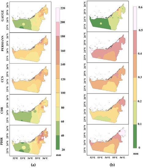 The trends in the daily averages, however, were slightly overestimated by almost all the products. This can be associated with the fact that the UAE experiences very few days of rainfall, and most of the days are considered as dry as shown in the CDD analysis. Since satellite products tend to capture atmospheric moisture, and therefore, the daily averages were slightly higher than the gauge values, as the products were still capable of capturing some daily readings. PDIR and CDR showed the highest daily average in the northernmost part of the country. The difference in the average annual and daily values between the gauge and PERSIANN family products was more pronounced for PERSIANN and CCS, while the least difference was displayed by CDR. Absolute difference plots were also developed to show the range of absolute differences between the gauge and PERSIANN product estimations (Figure 4). The CDR product showed the least difference in terms of annual averages (Figure 4a), while CCS and PERSIANN depict more differences, especially in the negative range, which shows that the values were higher than the gauge values. PDIR was second to CDR, showing the least difference in average annual values. A similar trend can be shown in daily average differences (Figure 4b).