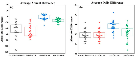 Figure 4. The absolute difference between average annual (a) and daily (b) values between the gauge and satellite products from 2011 to 2020.